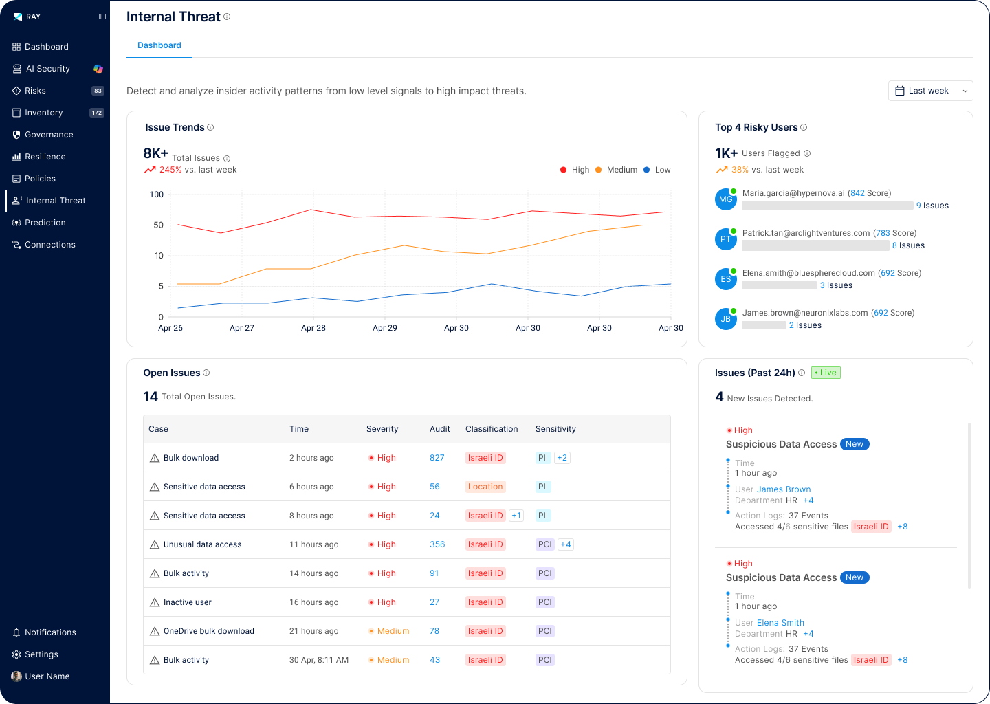 Insider threats are the hardest to detect because they come from authorized users. Ray Security’s predictive approach enables to:
