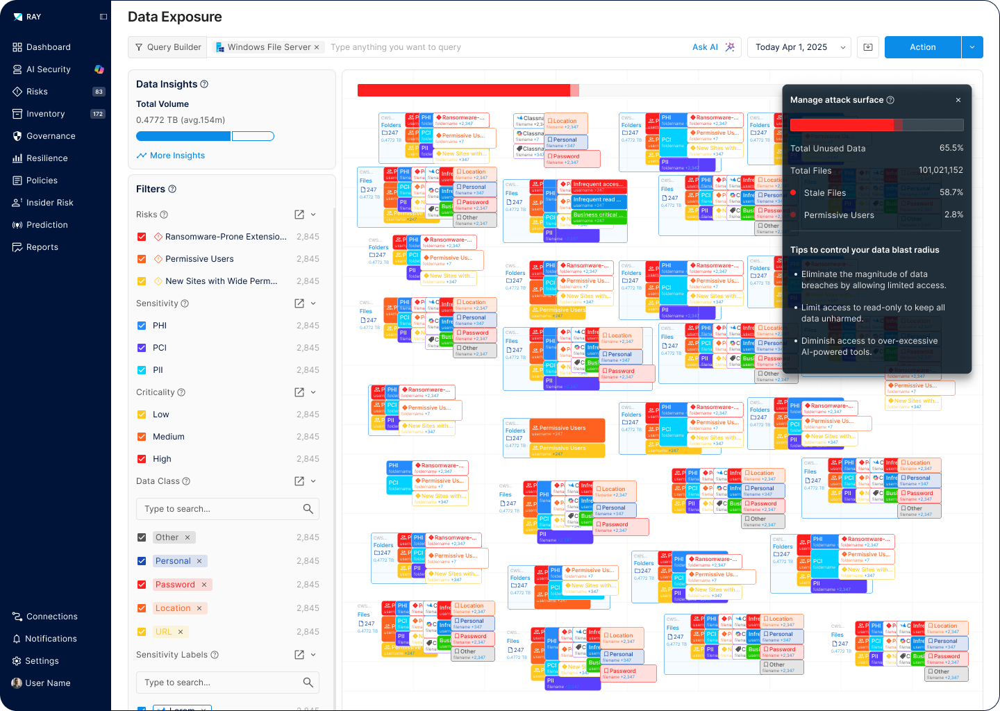 Most enterprise data sits dormant while creating massive attack surfaces. Ray Security’s predictive engine enables to: